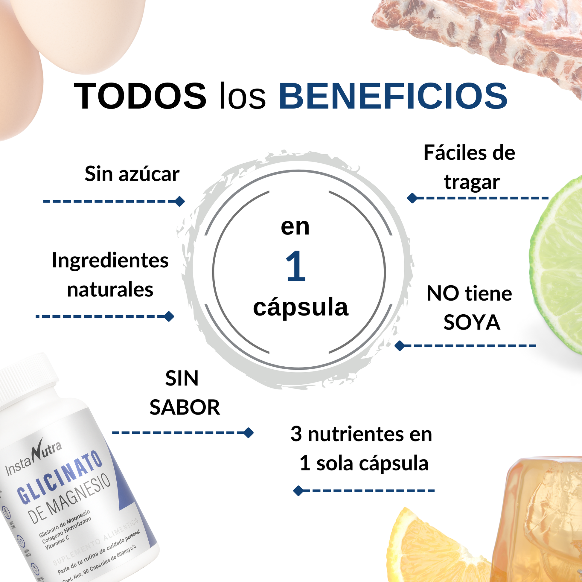 En esta cápsula reunimos Magnesio Glicinato, Colágeno Hidrolizado y Vitamina C, una combinación inteligente que te permite ahorrar tiempo y dinero sin sacrificar calidad. En lugar de tres frascos diferentes, obtienes una sola fórmula que lo tiene todo.