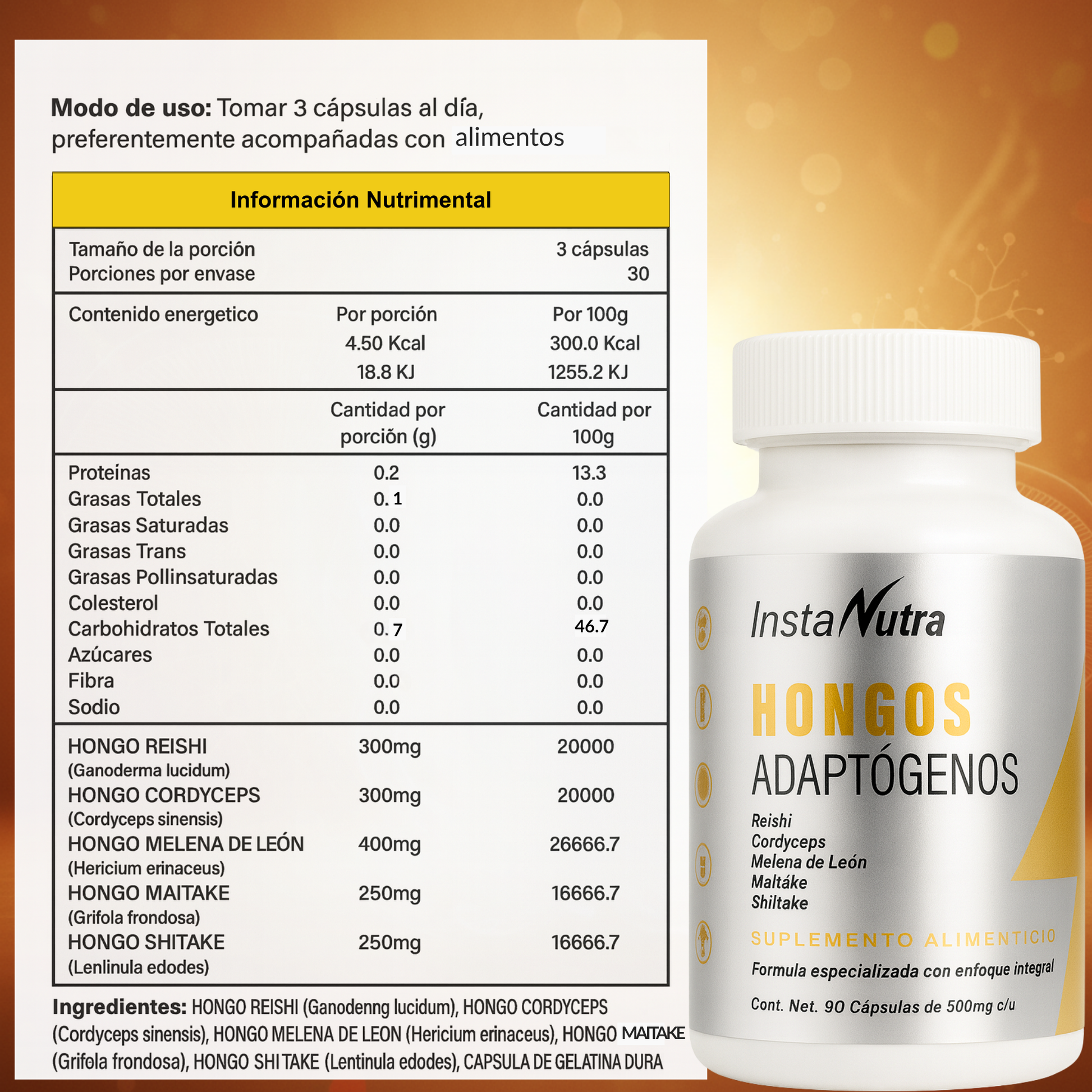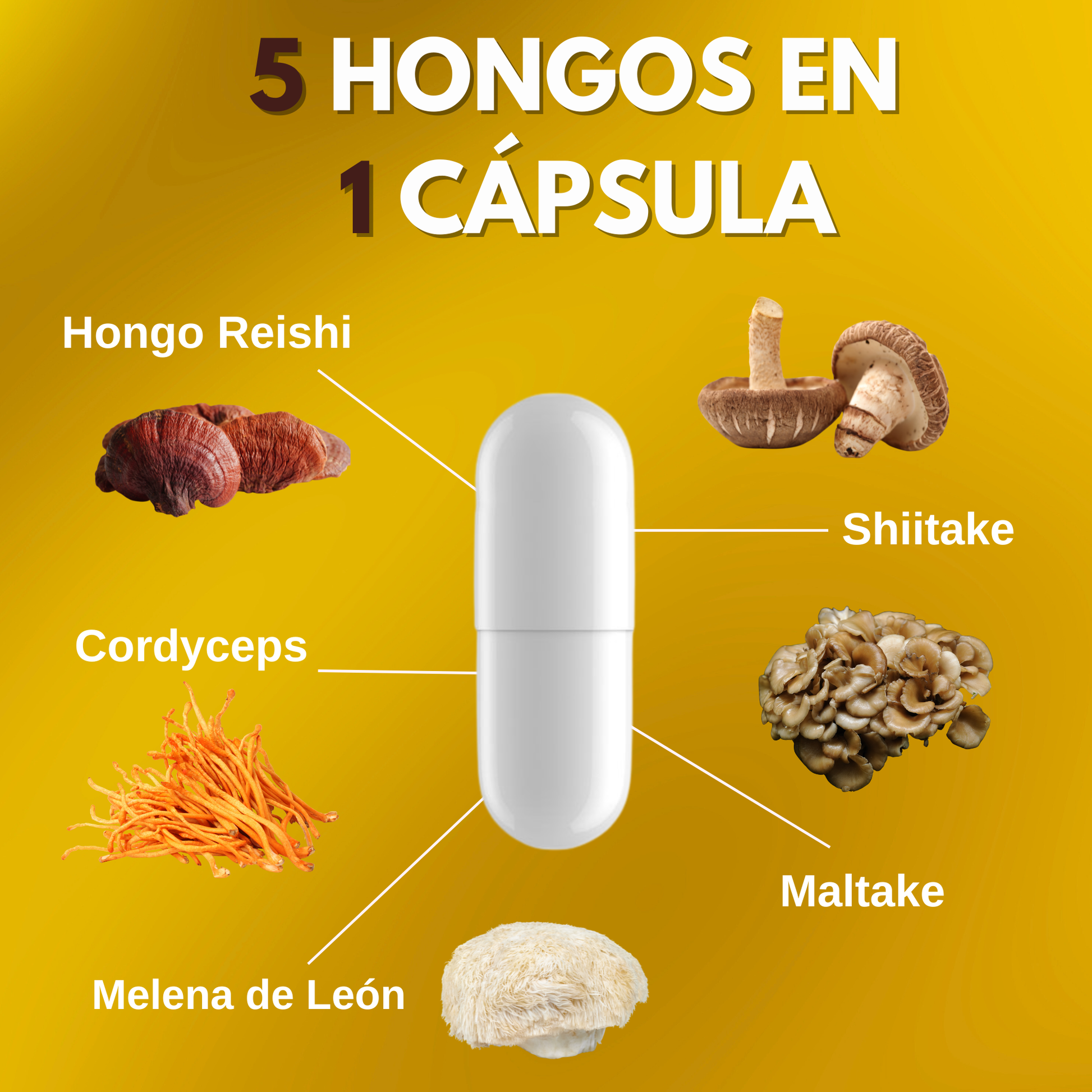 ¿Quieres más beneficios sin gastar de más? Este suplemento combina 5 hongos adáptagenos en una sola cápsula, lo que significa que ahorras tiempo, dinero y espacio. Una dosis diaria de 1,500 mg te acompaña en tu día a día con ingredientes 100% naturales.